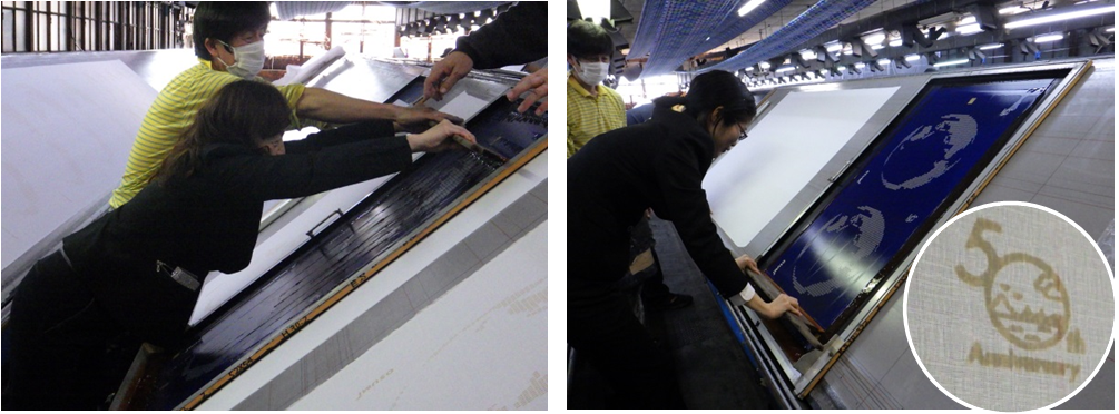 その状態で一定の力をかけて染めるのは至難の業でした。50年のロゴマークのつぶれ具合で職人さんとの違いが一目瞭然でした。型を外してみると背景色にも色ムラがあり、改めて職人さんの技術力を感じました。非常に貴重な経験となりました。