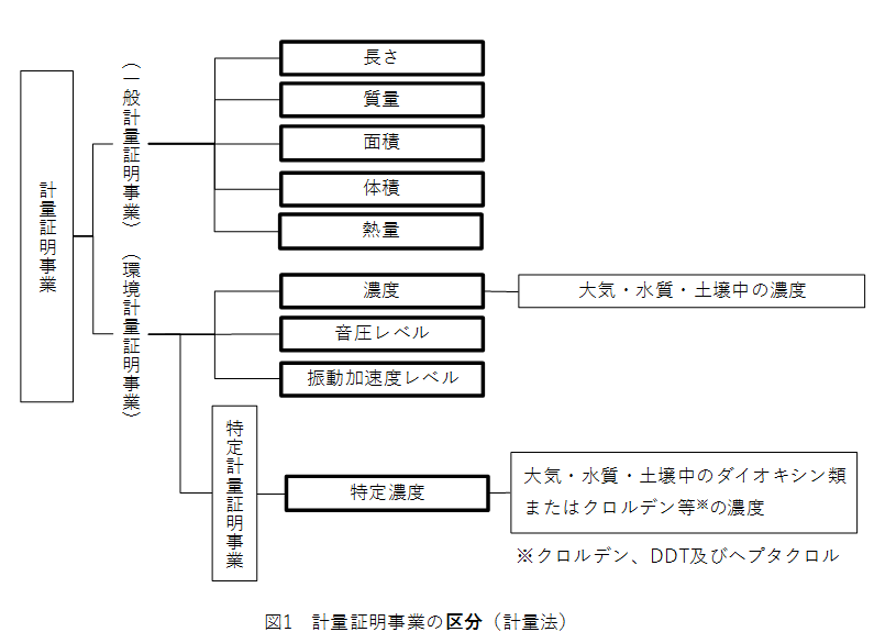 「環境計量証明事業」は濃度・特定濃度・音圧レベル・振動加速度レベルが対象となります。区分の中に特定濃度がありますが、これはダイオキシン類やクロルデン,DDT及びヘプタクロル(かつて殺虫剤として農薬に使われていた物質)の濃度が対象で特定濃度計量証明事業として別途定められています。計量証明事業の区分を図1に示します。